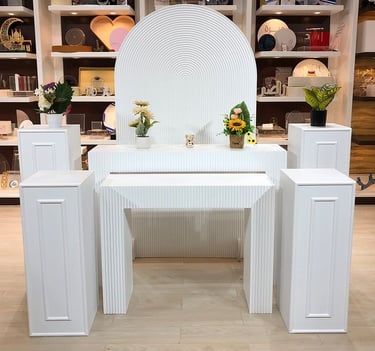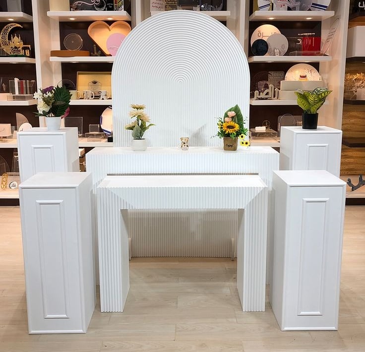 Sahneye yükseklik, denge ve katman hissi kazandıran tamamlayıcı elemanlar.Farklı yüksekliklerdeki sütun ve kaideler; çiçek aranjmanları, aksesuarlar ve dekoratif objeler için ideal bir taşıyıcıdır. Sahneyi üç boyutlu bir kompozisyona dönüştüren en etkili detaylardandır.
